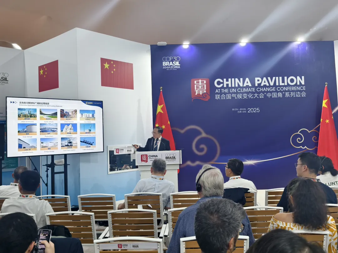 作为大会观察员,他向世界展示了一项源自中国“双碳”战略的颠覆性创新成果-无电制冷涂料,并提出了一个朴素而宏大的使命:“致力于让地球降一度”。