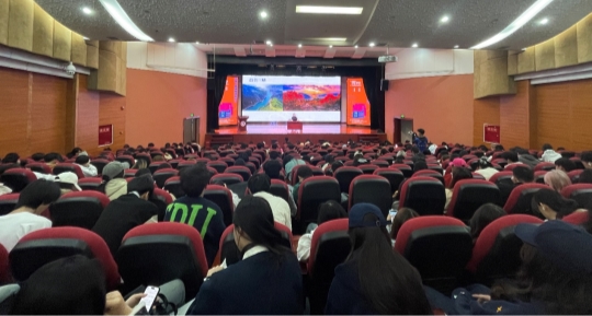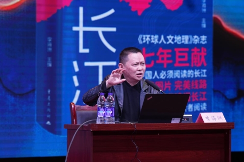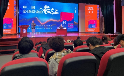 随后,主讲人李海洲总编辑以《只有一条长江》为主题,生动勾勒出长江的宏阔“生命轨迹”——从三江源湿地与西藏冰川的涓涓细流,到宜宾“万里长江第一城”的浩荡江面,约6300公里的江水串联起11个地域,其名称的变迁本身就是一部地理与人文交织的史诗。他从多维度解读了长江所孕育的文明与智慧,让在场师生深切感受到母亲河的深厚底蕴与磅礴生命力。